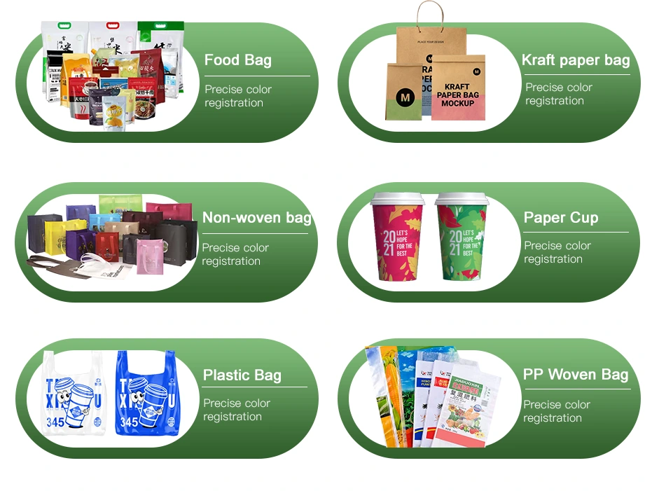 Vhodné pro PE, BOPP, PET, CPP, papír a další flexibilní substráty, ideální pro balení potravin, nákupní tašky, etikety a potisk různých flexibilních obalů.